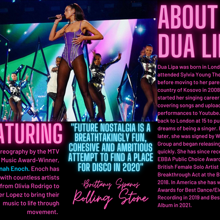This project outlines the details of a hypothetical tour for Dua Lipa's Future Nostaliga album, from the perspective of a tour manager. This project includes a booking packet, budget, employee information, and more.